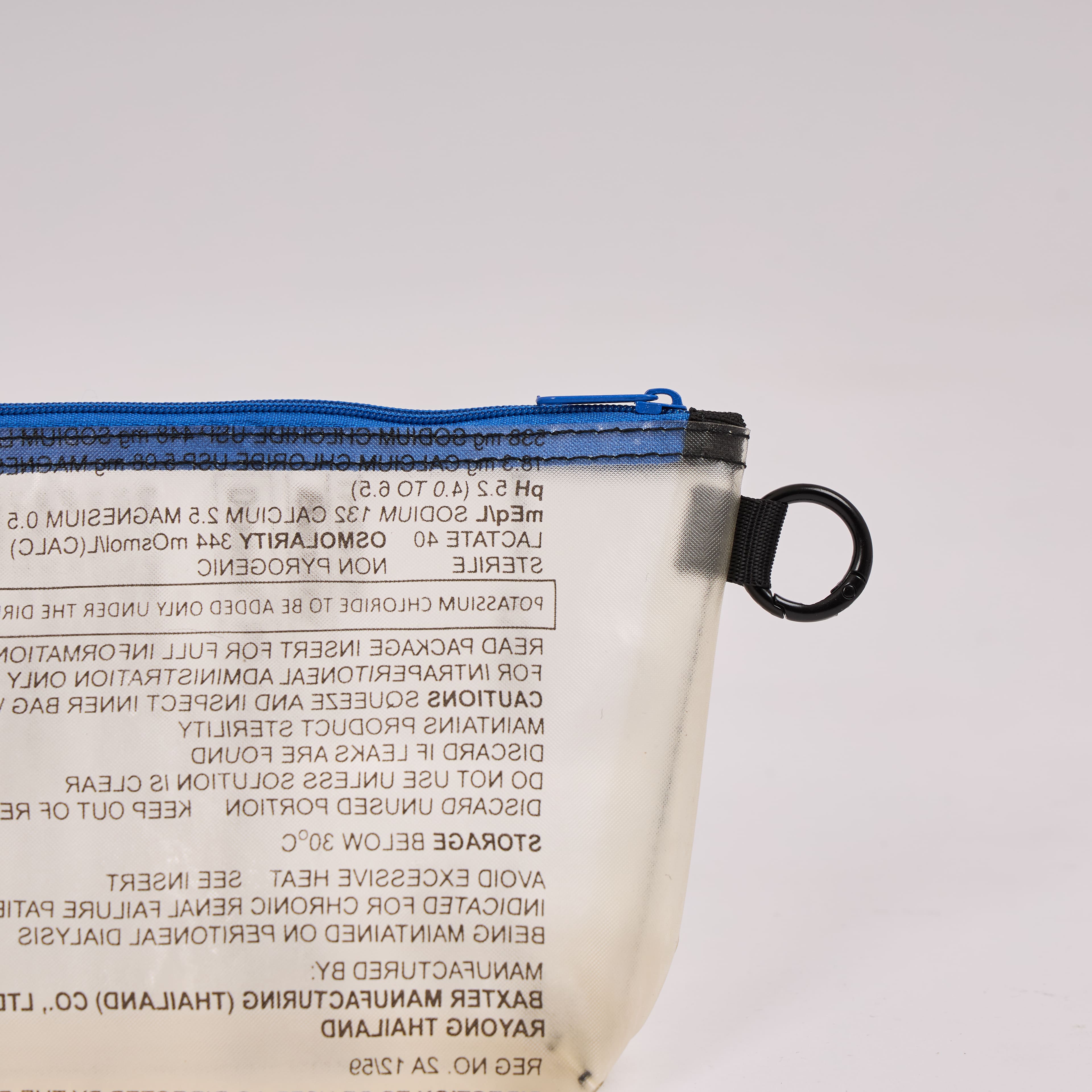 - Exterior: upcycled dialysis bag