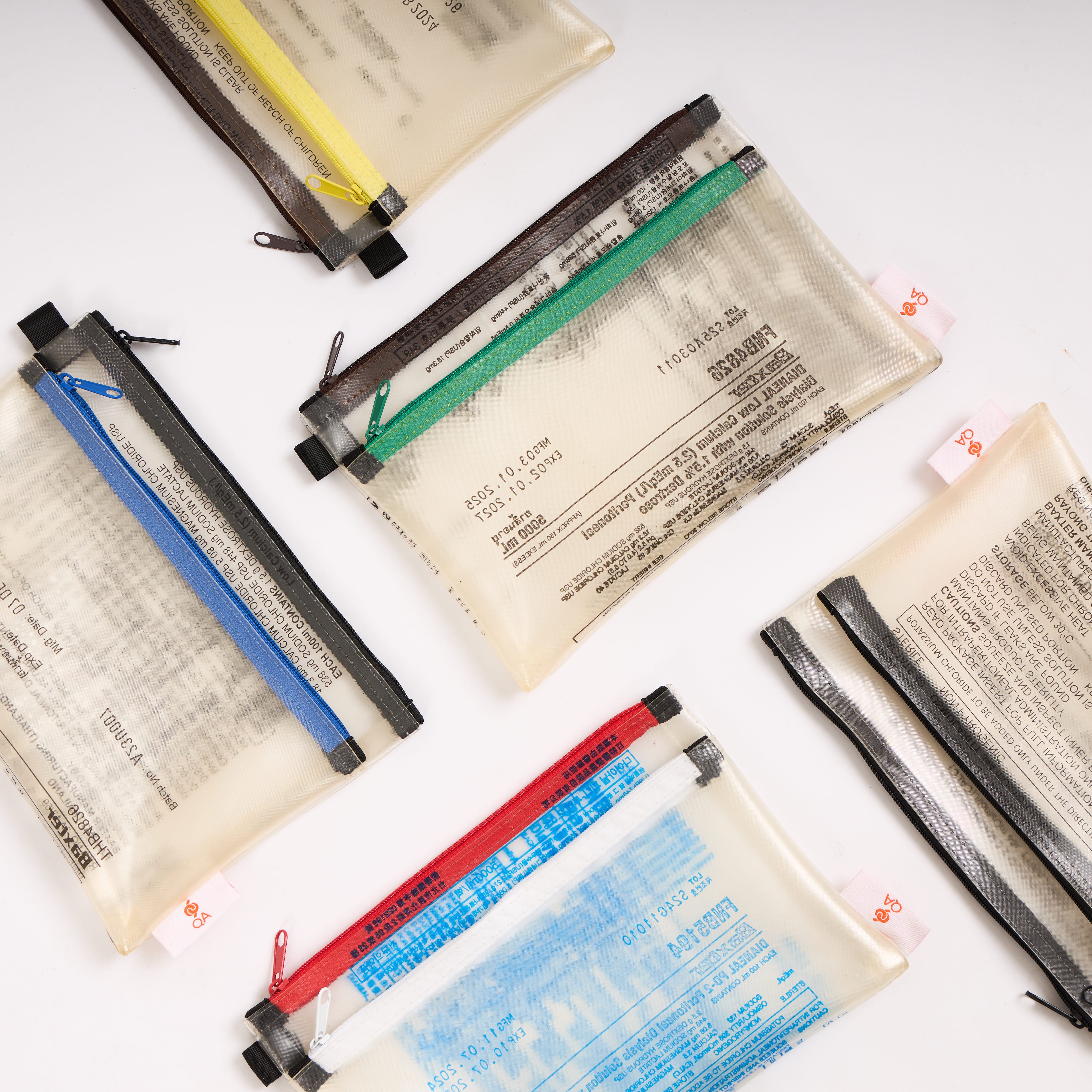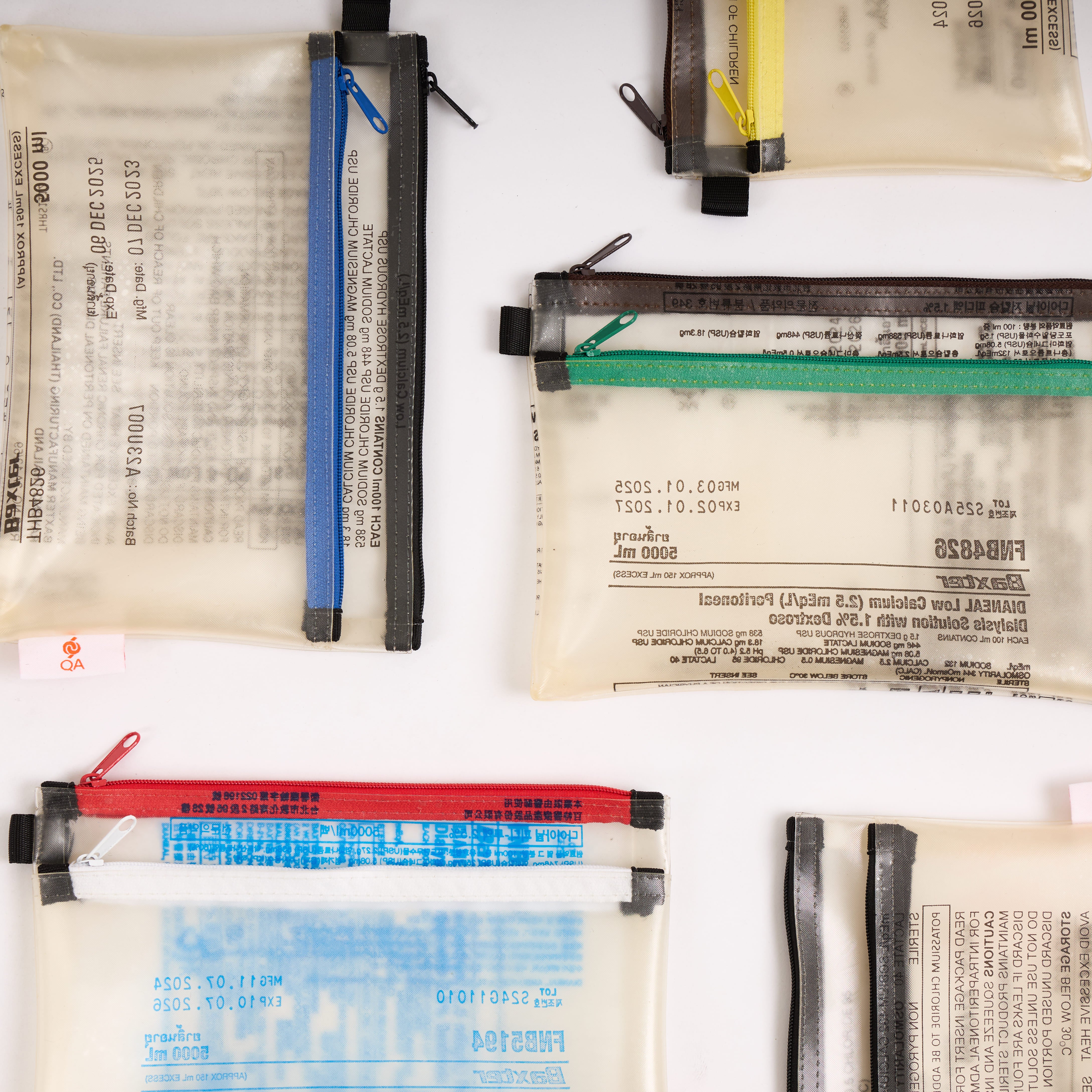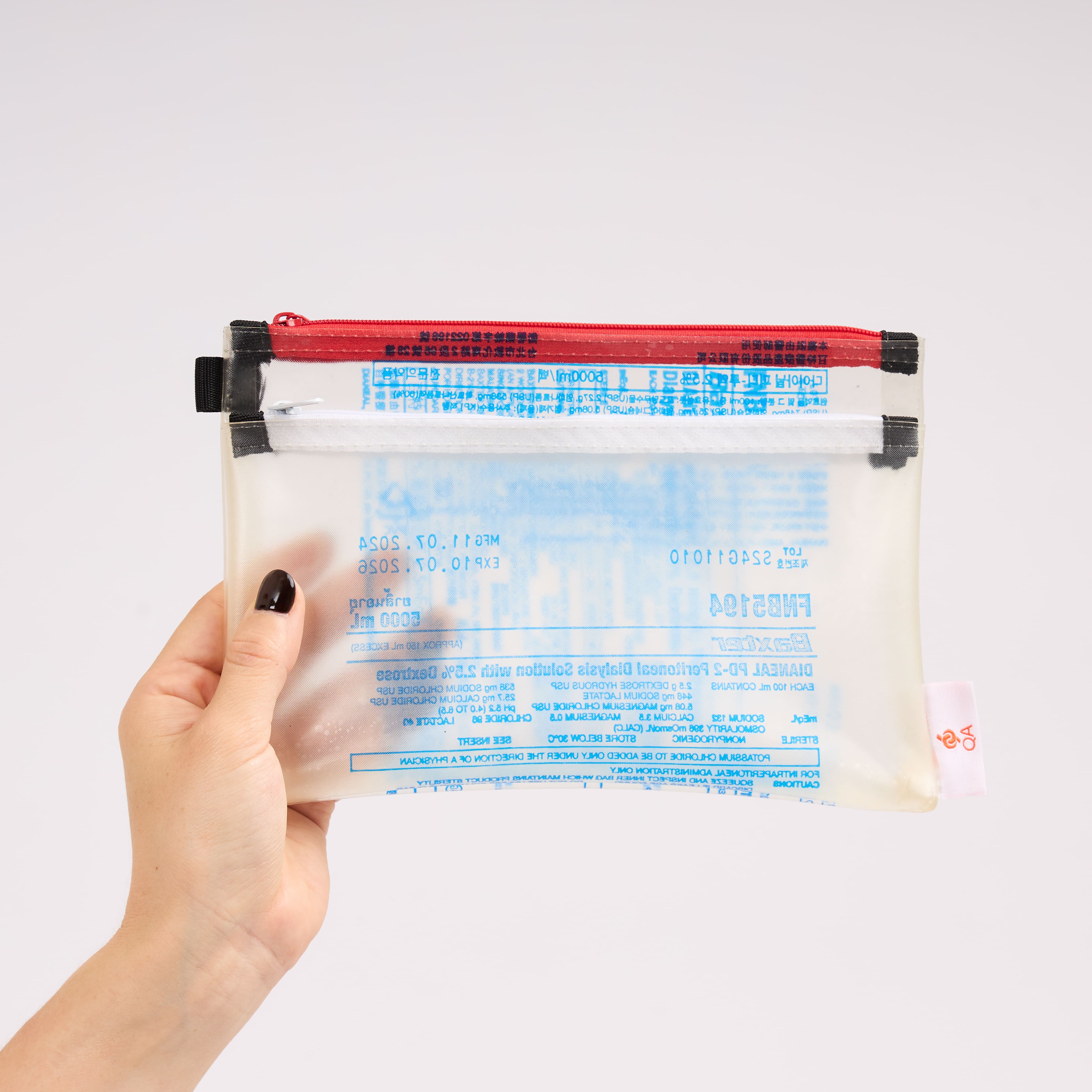- Crafted from 1.5 upcycled dialysis bags; each piece has a unique pattern.