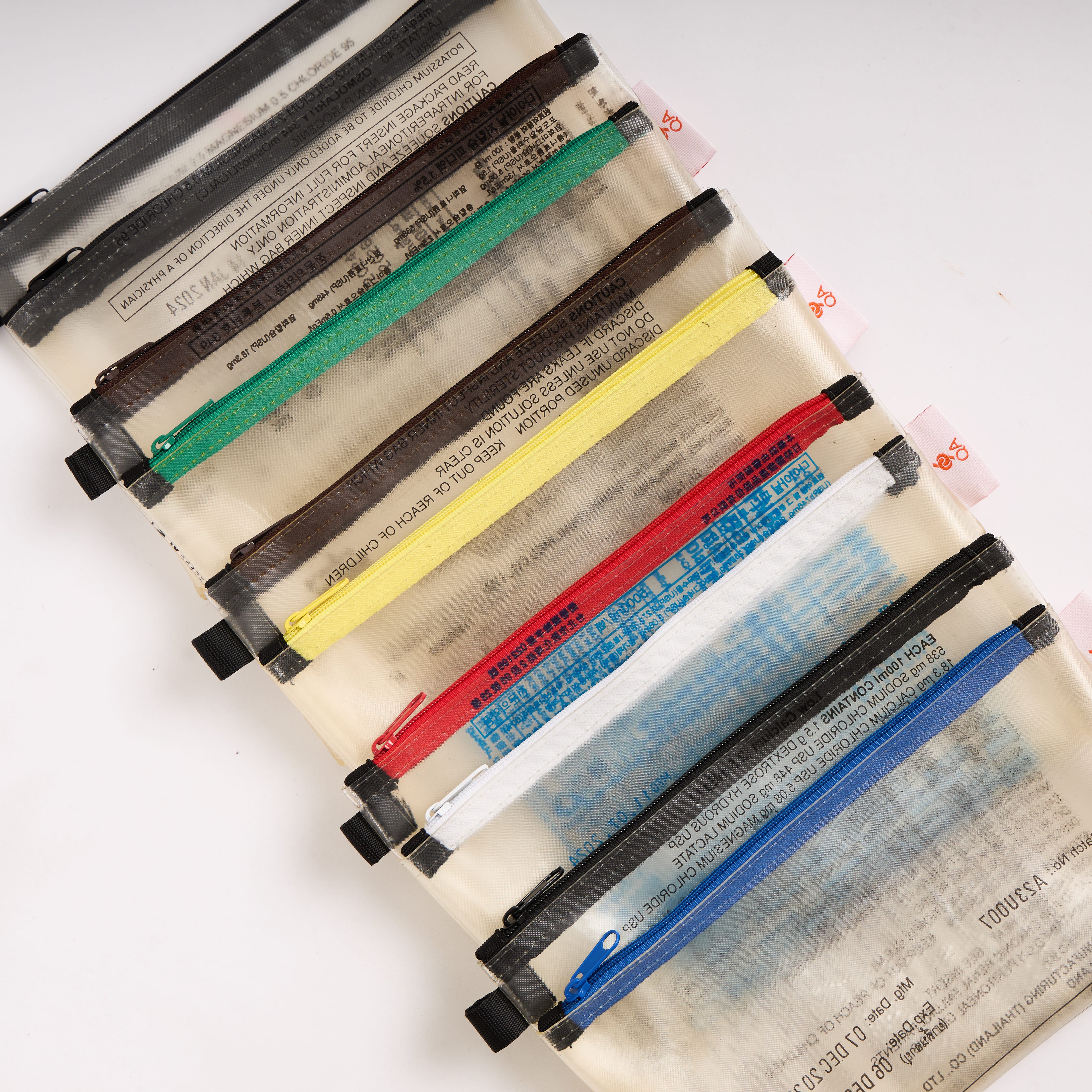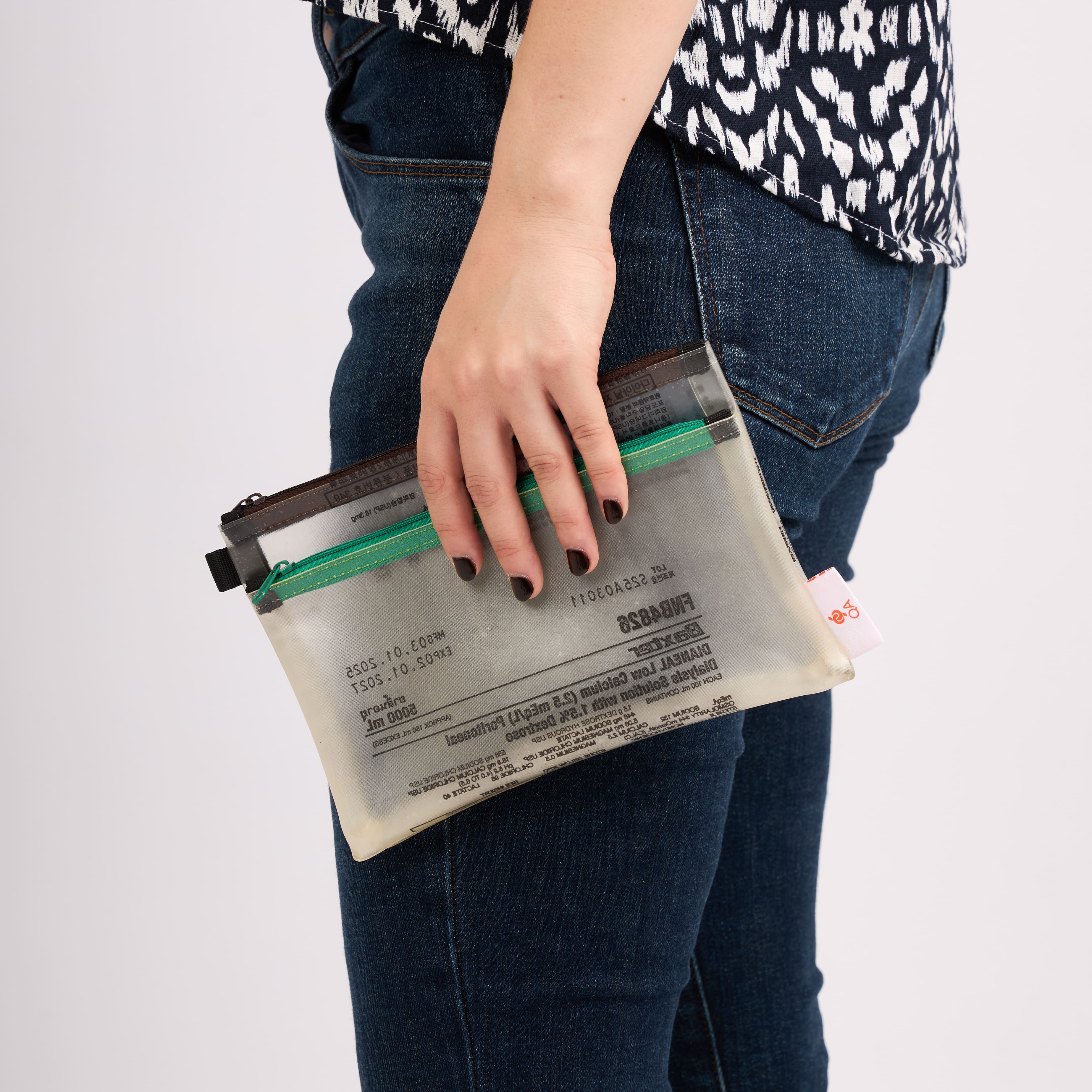 An eco-friendly and socially responsible pouch crafted from upcycled dialysis bags. With 2 compartments and a keychain hook, you can easily organize your essentials.
