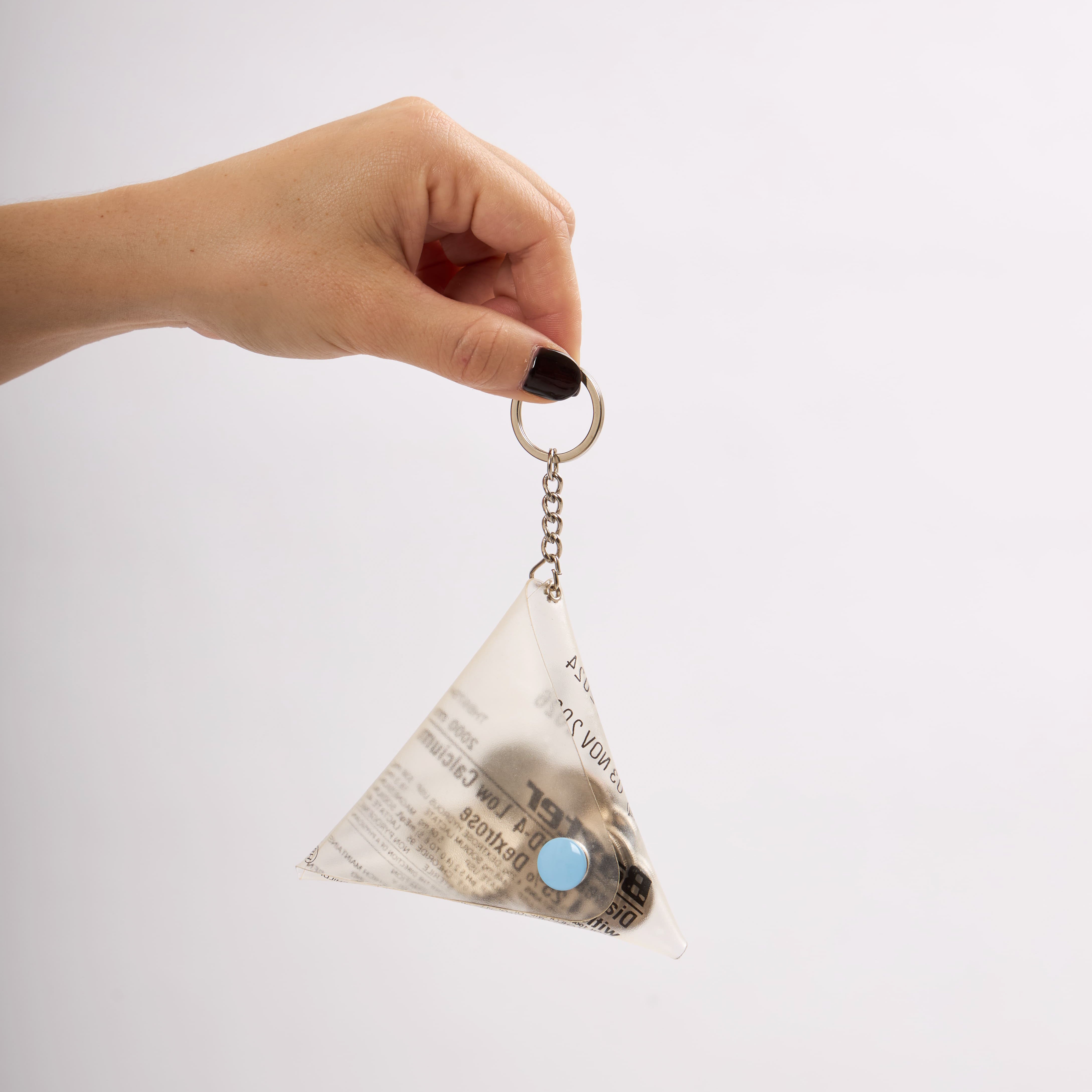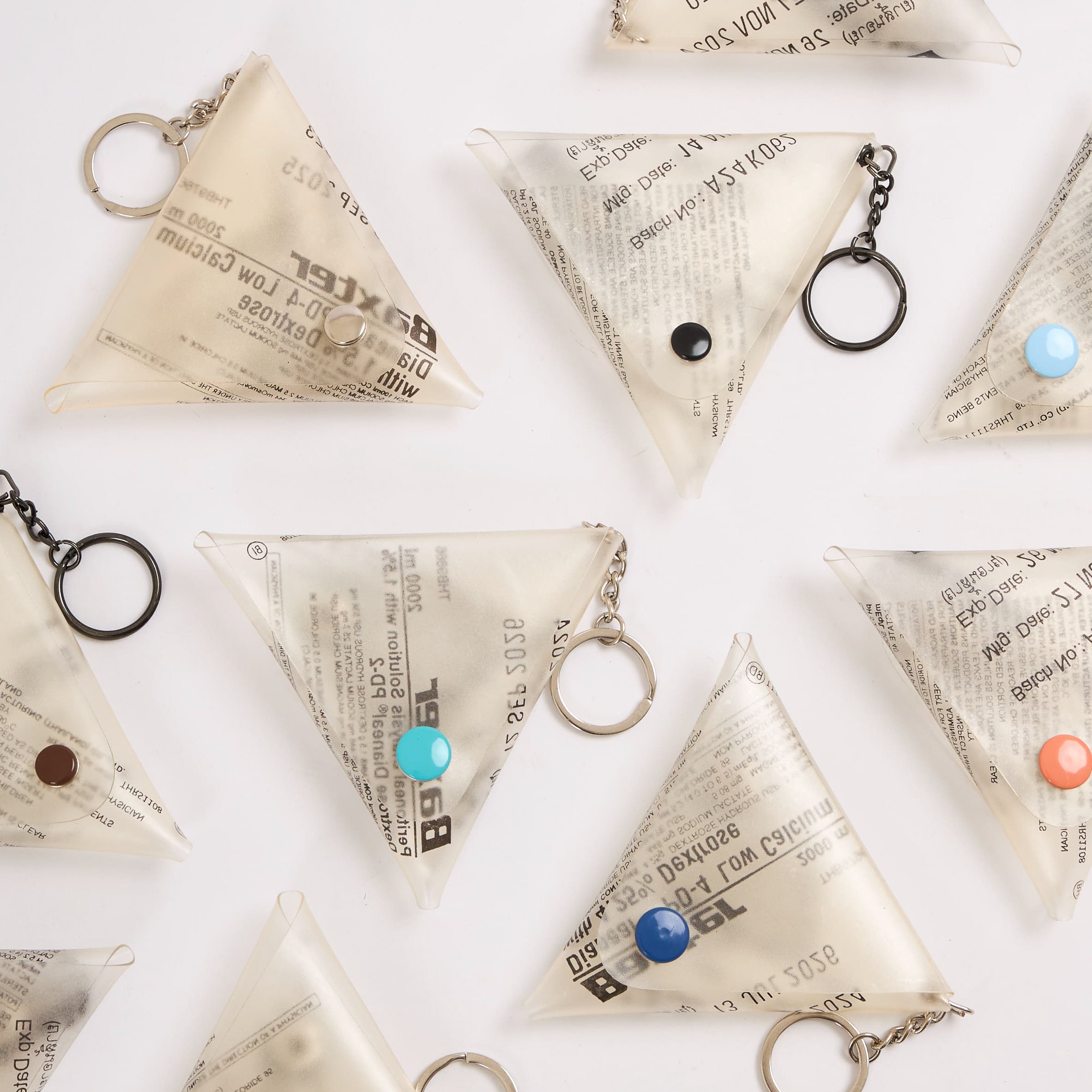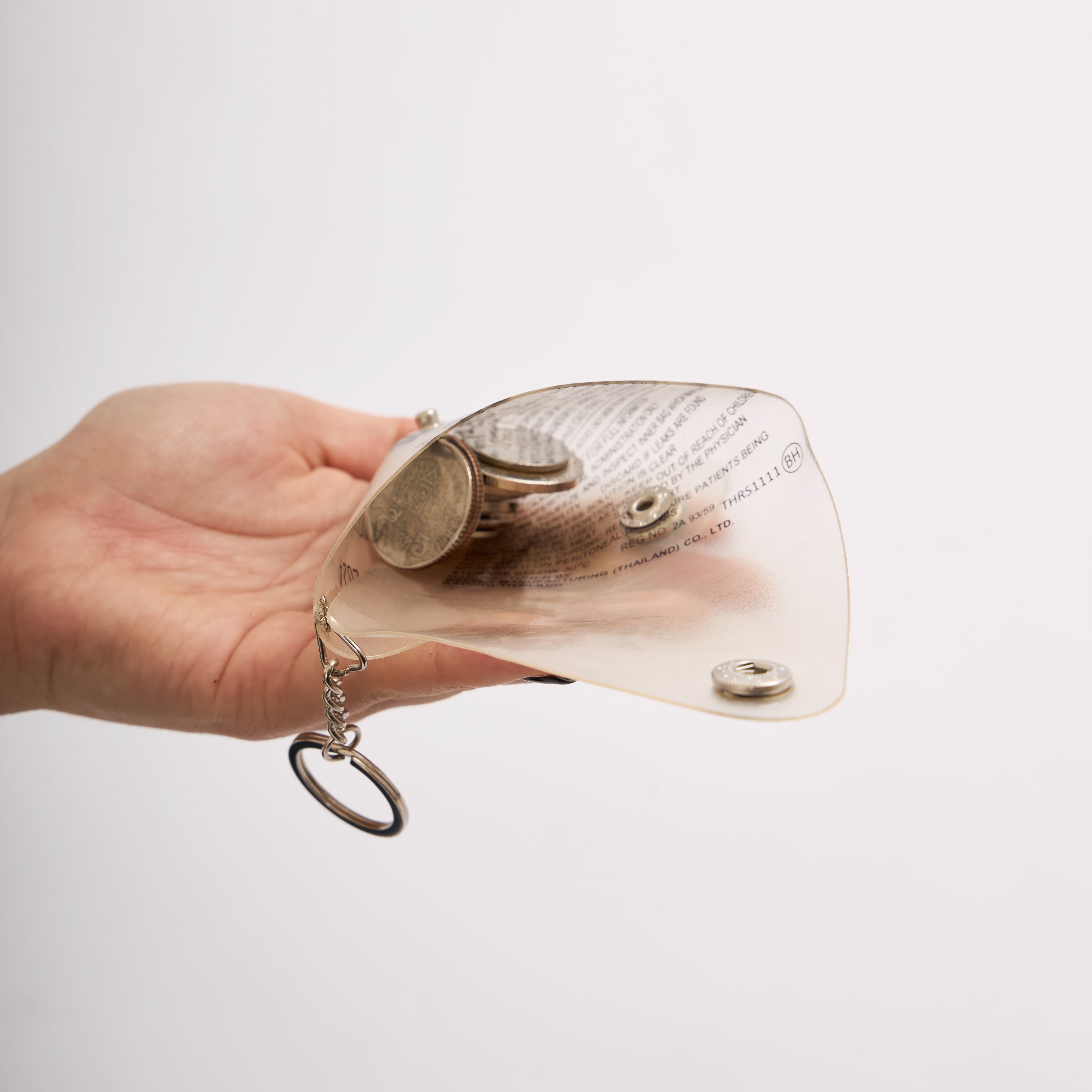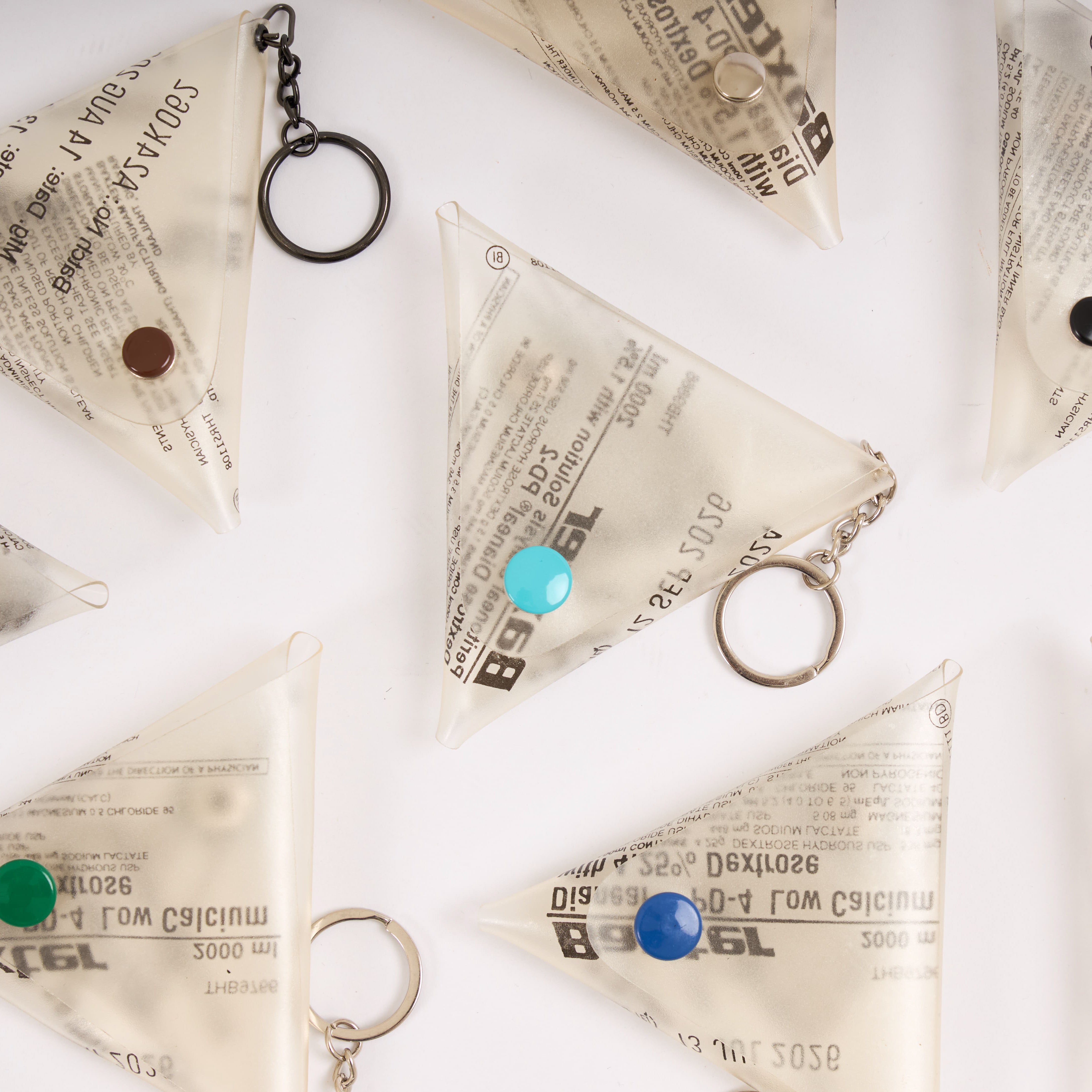 A versatile mini pouch crafted from upcycled dialysis bags.